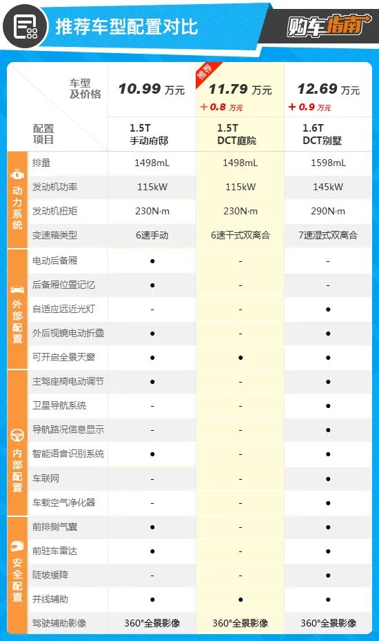 虽然配置完全足够家用,但之所以没有推荐全系入门的1.5T 手动洋房版车型,主要是因其匹配的6速手动变速箱并不太适合日益拥堵的城市用车环境。而在搭载自动变速箱的三款车型中,我们选择了价格最低的1.5T DCT庭院作为推荐,主要考虑到捷途X90 PLUS的受众群体普遍比较看重性价比。