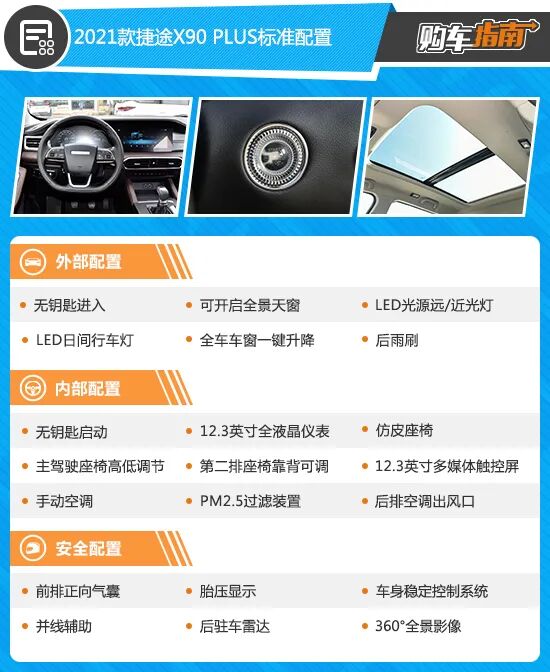 2021款捷途X90 PLUS的入门版车型保持了该品牌一贯高配置的表现,如无钥匙进入/启动、可开启全景天窗、LED大灯、全车车窗一键升降、12.3英寸全液晶仪表、12.3英寸多媒体触控屏、第二排座椅可调、后排空调出风口以及360°全景影像,均为全系标配,非常厚道。