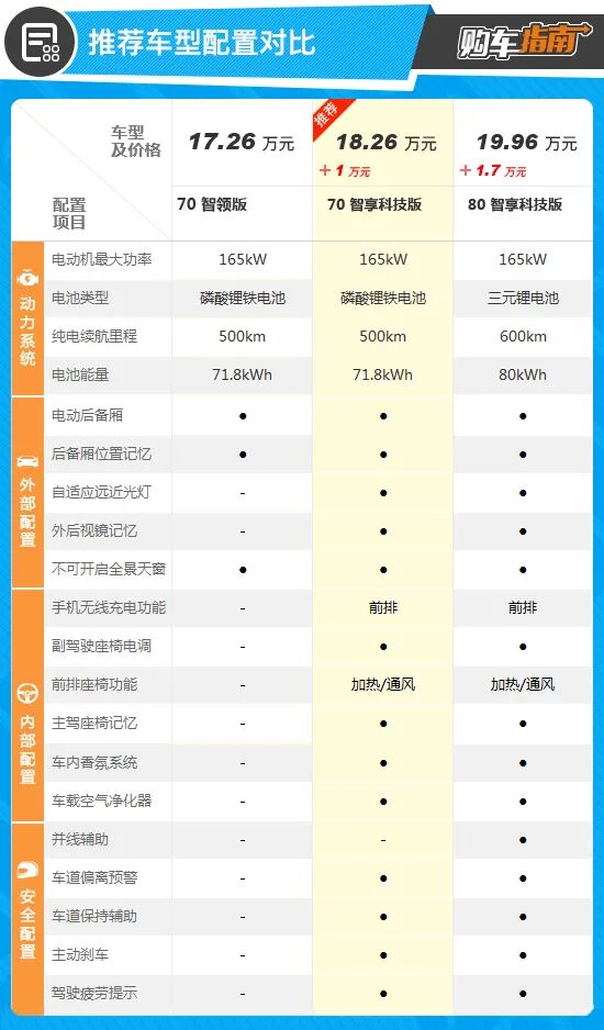此次没有推荐入门版车型原因很简单,作为一款拥有未来科幻设计的纯电动车,要是在配置上缺少了科技元素,不免有些遗憾。而推荐的70智享科技版刚好弥补了这些不足,如全速自适应巡航以及多项主动安全配置均有所配备,并且还增加了车内香氛系统和前排座椅通风/加热等舒适性配置,更能吸引讲究品质感的年轻消费者。