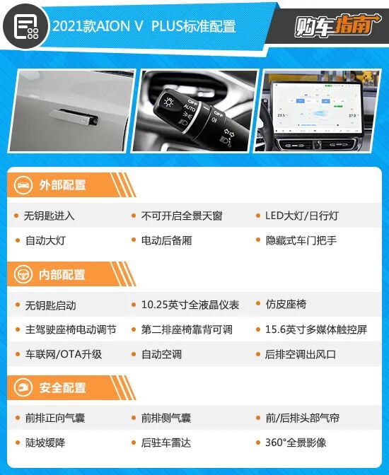 2021款广汽埃安AION V PLUS入门版车型有着较高的配置水平,除一些常见的基础功能外,还提供了蓝牙钥匙、带有高度记忆的电动后备厢、后排空调出风口、360度全景影像等实用配置,另外在被动安全配置上较为全面。