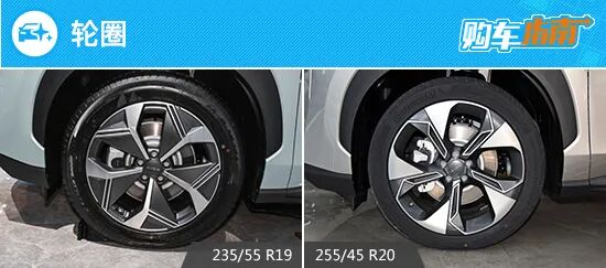 2021款广汽埃安AION V PLUS提供了两种尺寸的科幻造型五辐式轮圈,其中,70版车型均为19英寸铝合金轮圈,轮胎尺寸为235/55 R19,而80和90版车型则均为20英寸轮圈,匹配的轮胎尺寸为255/45 R20。