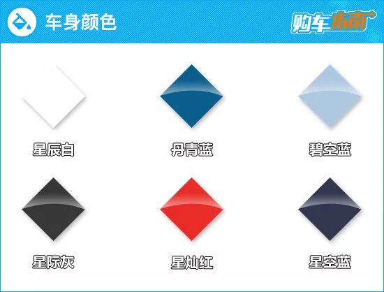新车提供星灿红、星辰白、星际灰、碧空蓝、丹青蓝、星空蓝六种车身颜色,覆盖的年龄层次更加广泛。其中碧空蓝和星际灰是新车的主打颜色。