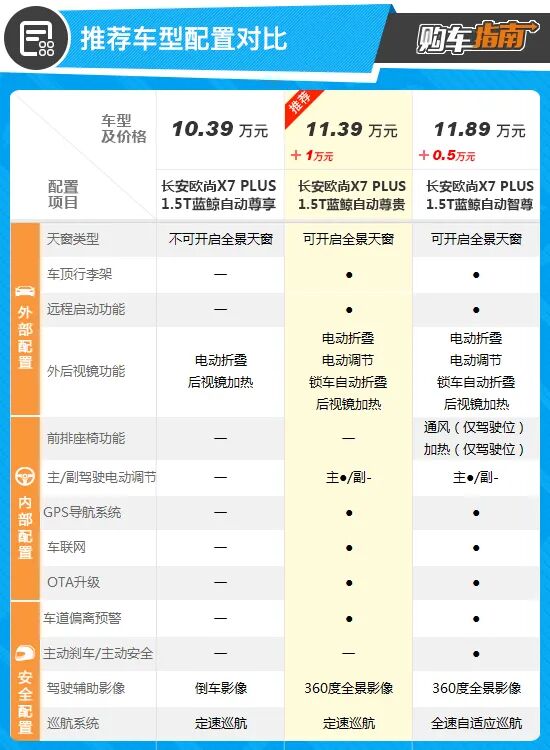 PLUS的购买建议,我们推荐您选择售价11.39万的1.5T蓝鲸自动尊贵型。相比低一级别的车型,推荐车型增加了1万元,但换来的配置上的升级是全方位的。实用性、舒适性和安全性配置得到了全面提升,增加了日常使用频率较高的内置行车记录仪、主驾电动调节、远程启动、卫星导航系统等实用性配置,同时还升级了可开启全景天窗和360度全景影像。此外,还加入了OTA升级功能。总体来看,这1万元还是花的挺值的。