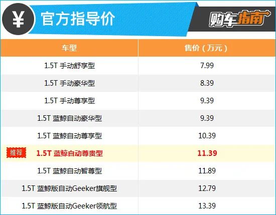 反观比推荐车型高一级别的自动智尊型售价,价格上比推荐车型贵了5000元。配置上增加了主动刹车、全速自适应巡航、驾驶位座椅加热/通风等,这些配置如果开车的时候想要更加轻松和舒适一些,还是不错的,不过对于这个价位的车型来说,其实没有太大必要。所以相比较而言,还是1.5T蓝鲸自动尊贵型性价比更高,在购买时可优先考虑。