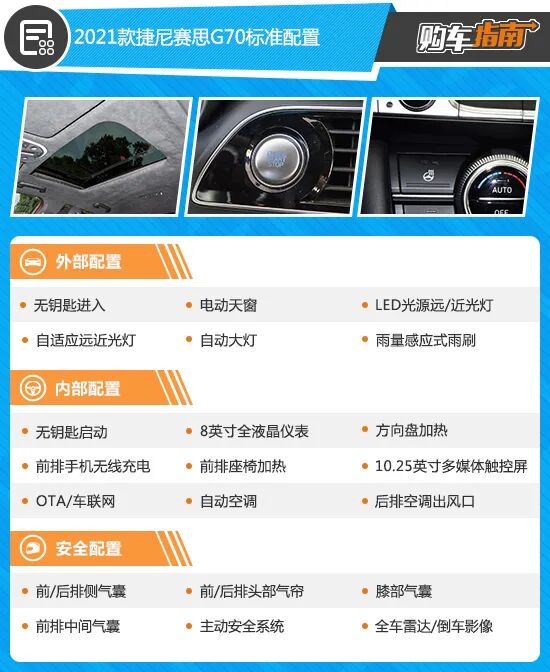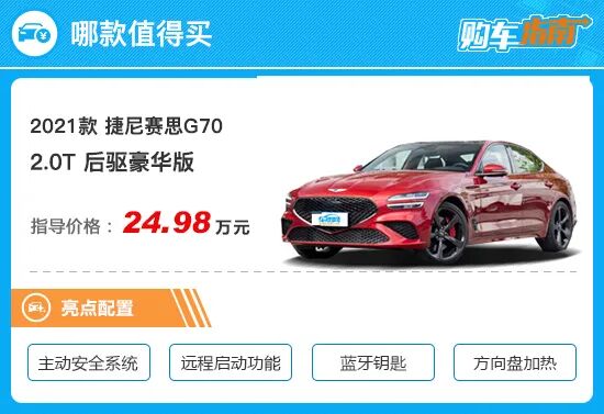 2021款捷尼赛思G70延续了韩系品牌一贯高配置的特点,即便是入门版车型也有着非常亮眼的配置水平。除一些常见的基础功能外,像方向盘加热、前排座椅加热、前排手机无线充电以及蓝牙钥匙等高阶功能也同样为全系标配,很令人意外。此外在安全配置方面,该车还提供了同级别罕见的膝部气囊以及前排中间气囊,并且有着极为全面的主动安全配置,表现可以说非常厚道。