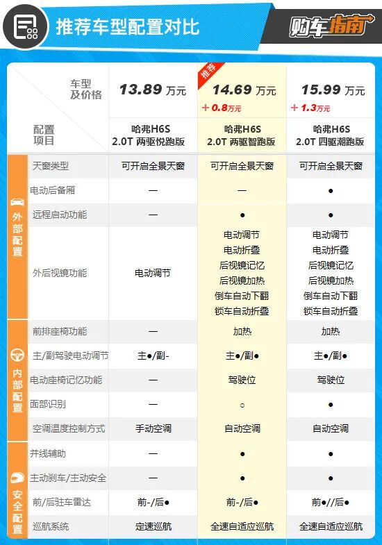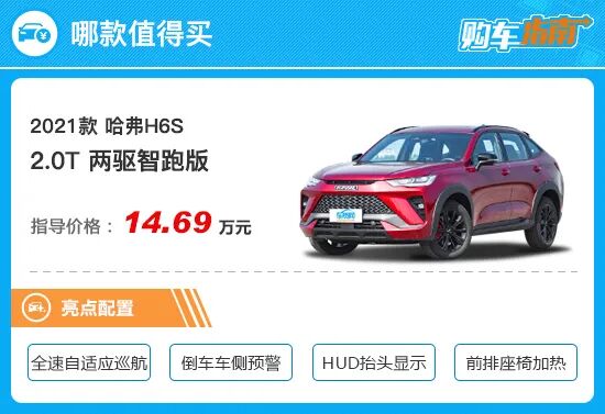 对于哈弗H6S的购买建议,我们推荐您选择售价14.69万的2.0T两驱智跑版。相比低一级别的车型,推荐车型增加了8000元,但换来的配置上的升级是全方位的。如增加了并线辅助,主动刹车,定速巡航也升级为全速自适应巡航,安全配置更为全面。此外,还新增了驾驶位座椅记忆、副驾驶电动调节以及前排座椅加热功能,空调升级为自动空调,对于舒适性方面的提升是很明显的。整体来看,这8000元的差价还是花的挺值的。