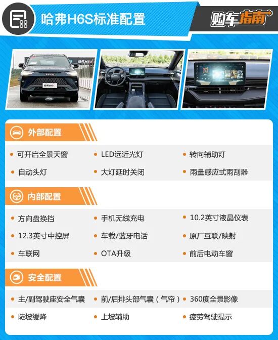 哈弗H6S共推出5款配置车型,其中3款燃油版车型,2款混动版车型。其中入门车型2.0T悦跑版售价为13.89万,从配置层面来看较为全面。外部配置上具备了主流的LED远近光灯,转向辅助灯等,在安全性和科技感上都有了保证。在便利性方面还配备了可开启的全景天窗和大灯延时关灯等。内部配置也非常丰富,12.3英寸中控屏,10.2英寸液晶仪表都是标配,值得注意的是新车还标配了手机无线充电功能。整体来看,哈弗H6S的入门版车型表现可圈可点,常规的配置均有所搭载,满足日常的驾驶需求不成问题。只是在驾驶辅助方面还是有所欠缺。不过这才只是入门车型,我们接着往下看,也许还有更多惊喜。