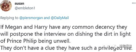 脑回路更清奇的还直接炮轰哈利,说哈里不配一直把自己当受害者。因为菲利普亲王的童年比他惨多了...