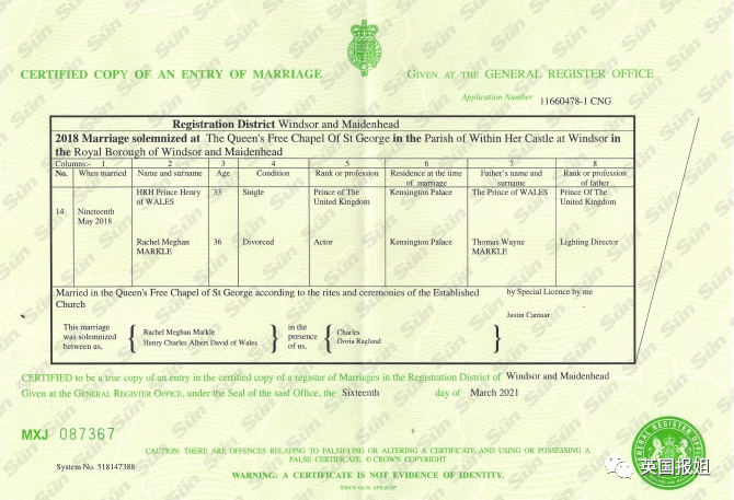 英格兰教会主持的婚姻,合法婚姻必须有两名除牧师和新人外的证婚人。而梅根说当时除了主教没有任何人,那么要么这件事就是假的,要么这个提前的婚礼就是没有法律效益的,也就不可能有公正的结婚证书。