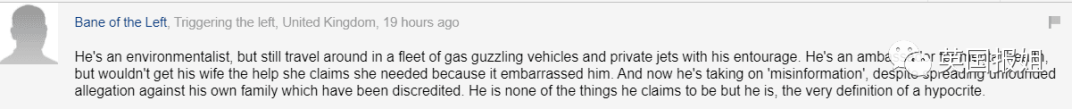 “他是一个环保主义者,但仍然和随行人员一起乘坐高耗油汽车和私人飞机。他是一位心理健康大使,但却不愿让妻子得到所谓的帮助,因为这让他很尴尬。现在他开始对抗错误的信息,尽管他对他自己的家族散布毫无根据的指控。他不是他自称中的那些人,但他是教科书般的伪君子。”