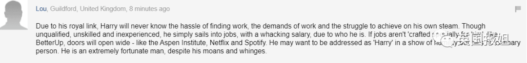 “由于与王室的关系,哈里永远不会知道找工作的痛苦,找工作的急切,以及靠自己努力的奋斗。尽管他不称职,没有技能,也没有经验,但由于他的出身,他就能一帆风顺地干着一份薪水不菲的工作。