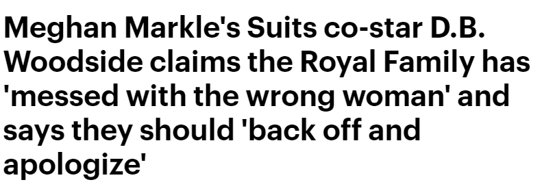 最近梅根在拍《金装律师》期间的演员同事D.B. Woodside出面力挺梅根,指责王室。