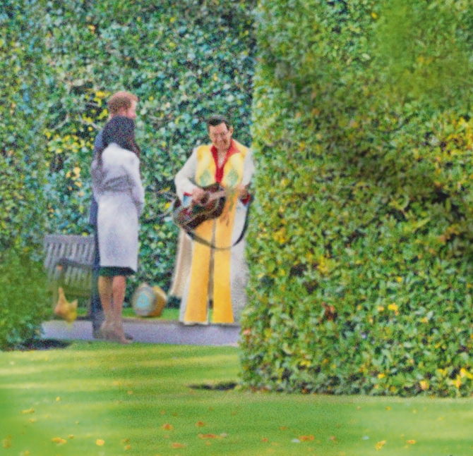 教袍里居然穿上了全套猫王cos服,头上戴着猫王假发,在花园里给梅根哈里模仿猫王弹唱!!!