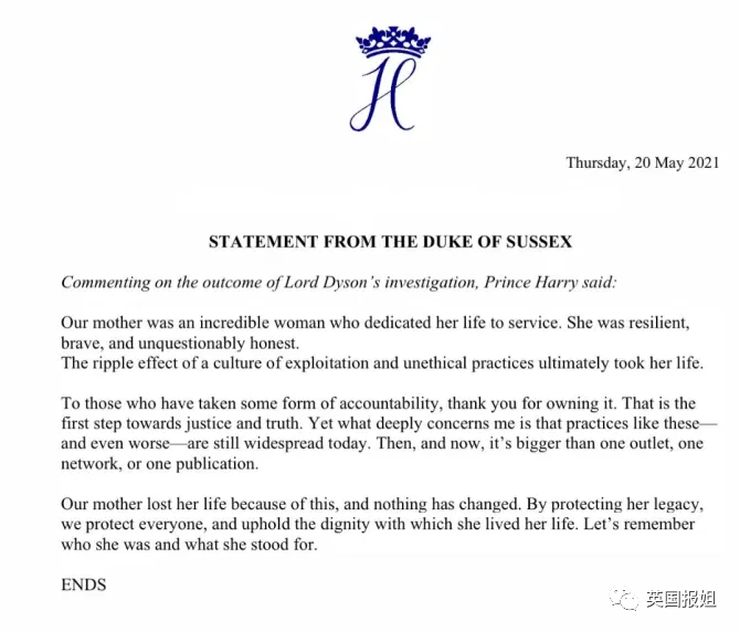 “虽然报告指出威尔士王妃戴安娜热衷于接受BBC采访,但寻求采访的过程显然与公众合理期望远远不符。”