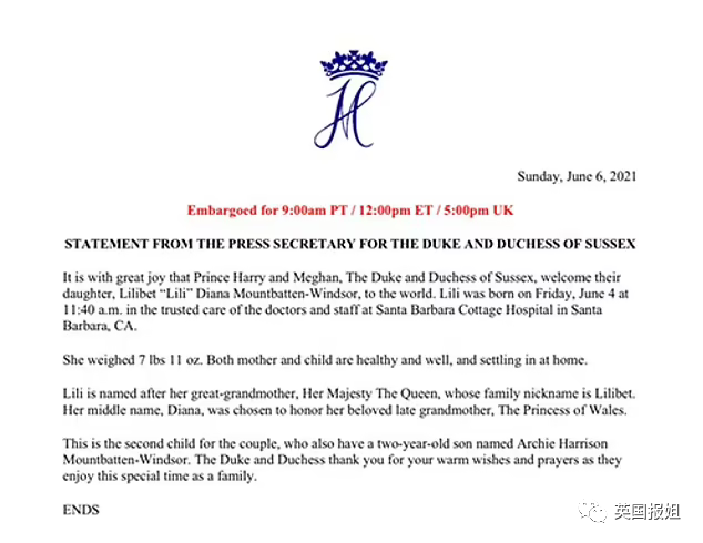 昨晚梅根和哈里宣布,他们的第二个孩子顺利降生,和之前预告的一样,是个女孩!全名是:莉莉贝特·戴安娜·蒙巴顿-温莎(Lilibet Diana Mountbatten Windsor)