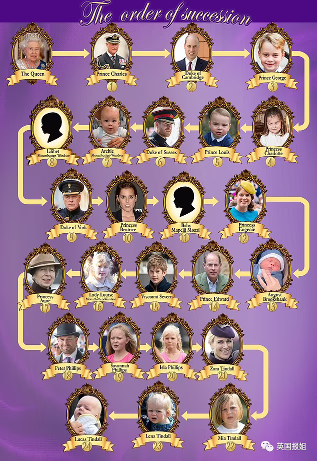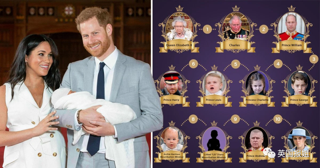 莉莉出生后成为英国王室第八继承人,前面是查尔斯,威廉,乔治,夏洛特,路易斯,哈里和阿奇。