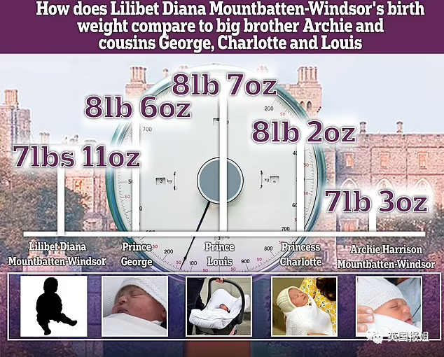 莉莉比阿奇小两岁零一个月,只有7磅11盎司(7.37斤)。顺便说一句,凯特的小儿子路易斯王子是王室100年来最重的宝宝,大概是7.6斤。
