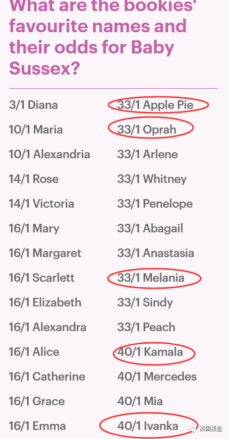 当然还有一些沙雕网友瞎下注,比如有人猜哈里和梅根会给女儿起名:苹果派,奥普拉,卡马拉,伊万卡,甚至还有梅拉尼娅...