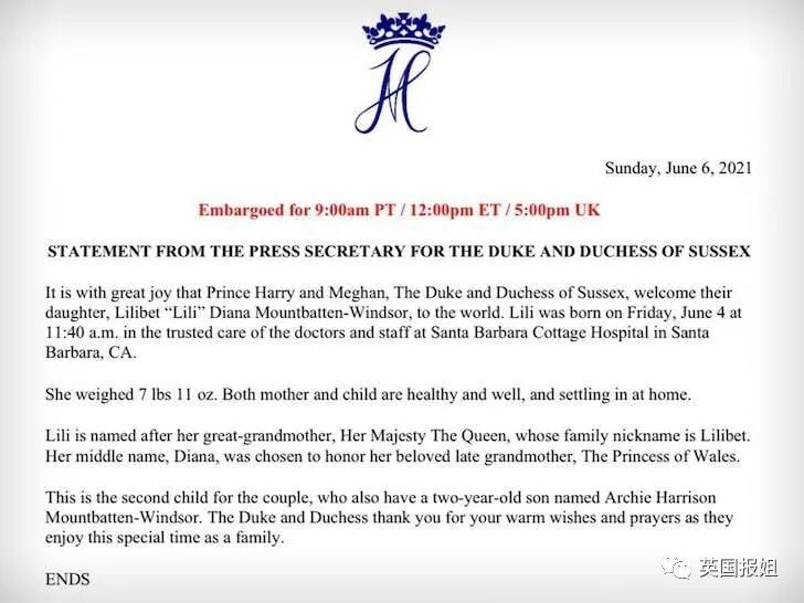 隔了两天,哈里梅根夫妻俩直接在自己的网站上,公布了孩子出生的消息,其中包括孩子的出生时间、体重这些细节。