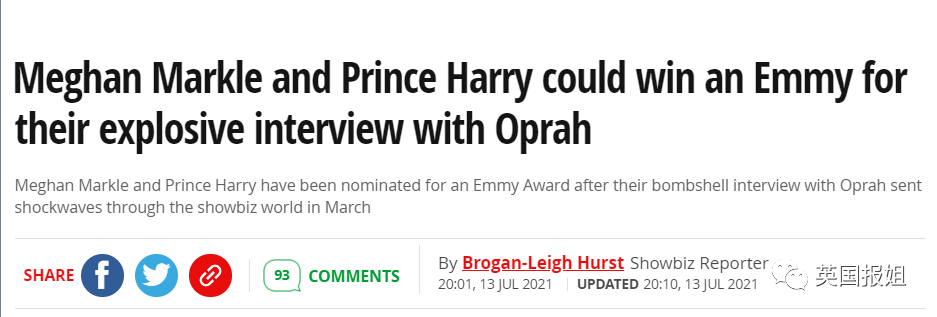 “哈里梅根因为在奥普拉访谈上的爆炸发言,可能要拿艾美奖了。”