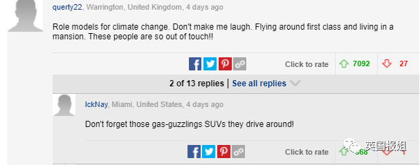 “环境保护的榜样?别逗我笑了。天天头等舱飞来飞去,开着耗油量巨大的SUV,住在豪宅别墅。他们太不像话了。”