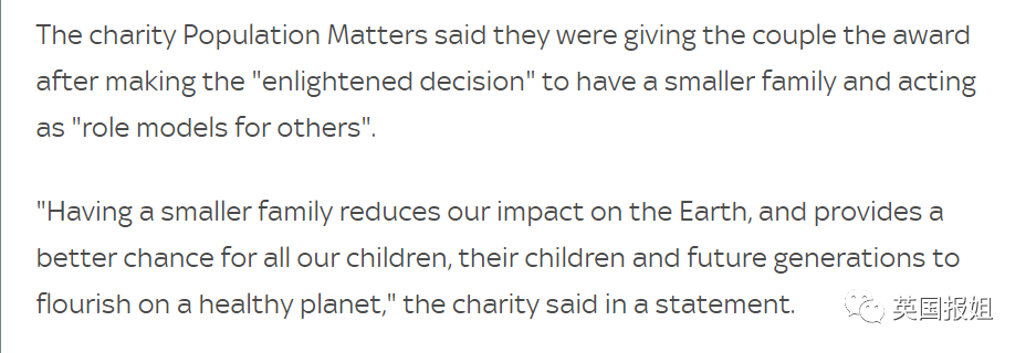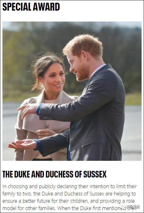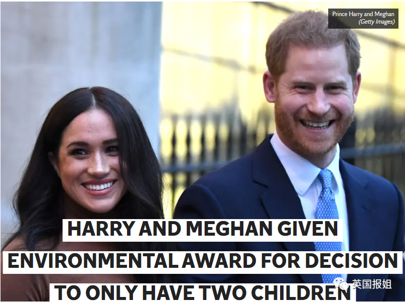 这番动人言论打动了英国人口问题慈善组织,于是决定授予哈里夫妻“环保榜样”的称号。