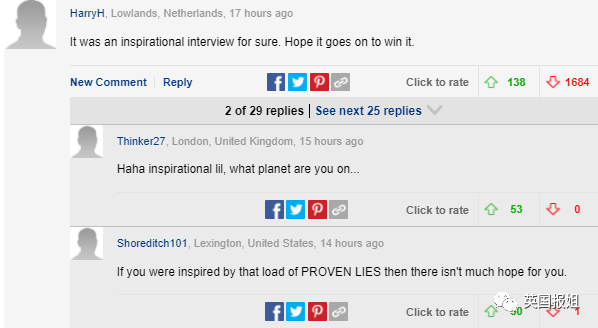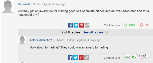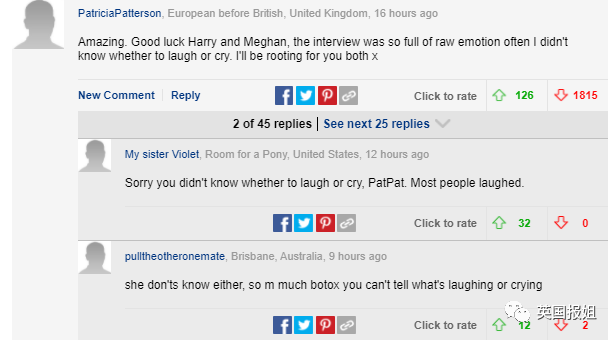 即使偶尔有几个为梅根和哈里说话的,也都被冲烂了……点踩人数是点赞的15倍。