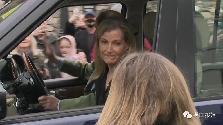 亲王刚去世不久,她和爱德华从温莎城堡看望完女王出来,摇下车窗和等候的民众问好,眼泪汪汪。