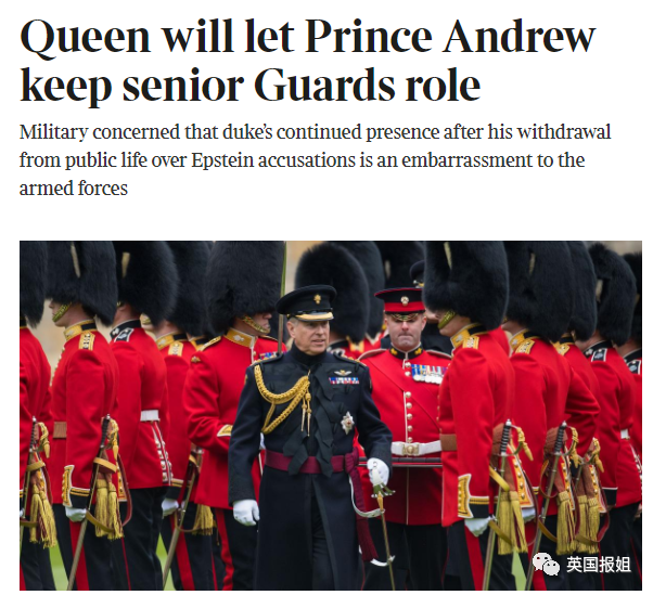 据消息人士透露,女王“让人们知道”,她希望安德鲁王子继续担任掷弹兵卫队上校的军职,军方对女王的这一决定感到大为震撼:哈???不了吧?!!