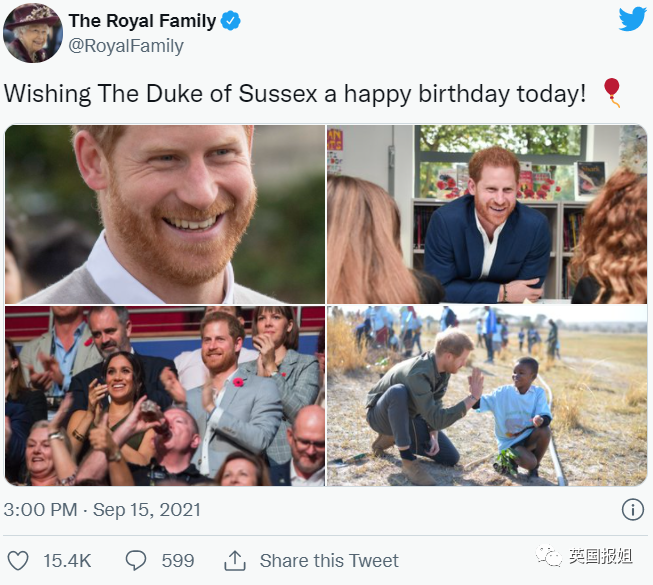 女王用她的官方账号发布:“祝萨塞克斯公爵今天生日快乐!”