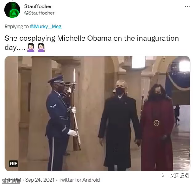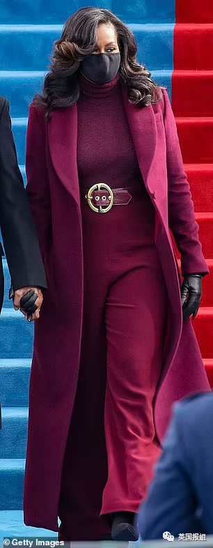 因为很多人发现,梅根这套行头和今年年初米歇尔·奥巴马参加拜登就职典礼上的那一套红色礼服,怎么看怎么像。