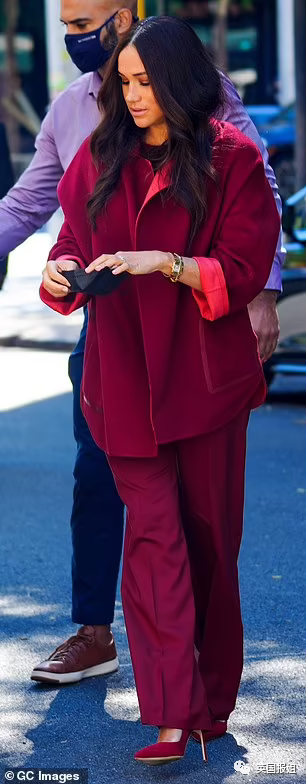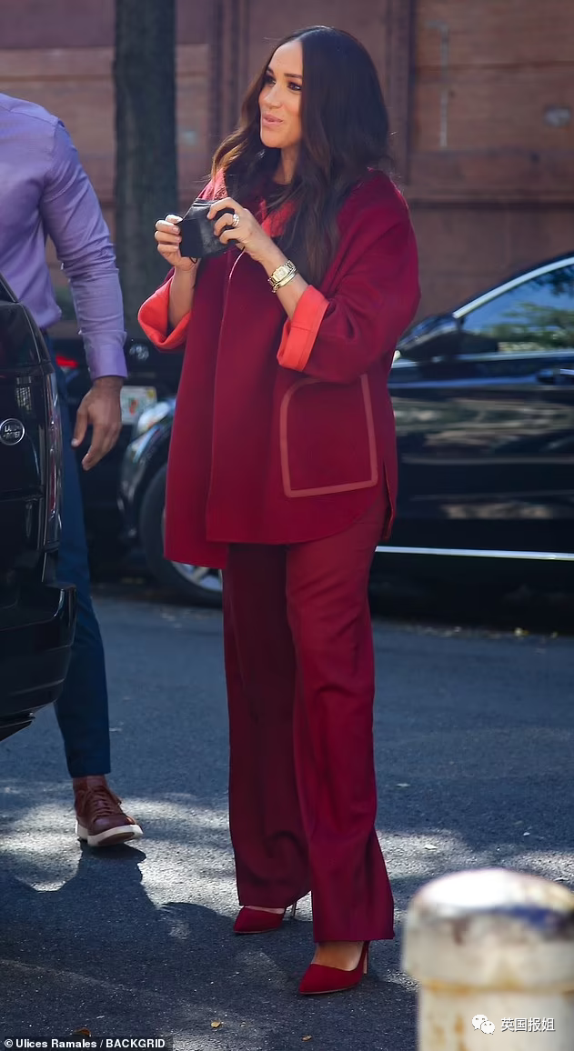 第二天的行程是去看望纽约学校里的贫困儿童,梅根身穿价值4274 英镑洋红色的大衣,搭配1231英镑的阔腿裤和424英镑的红色高跟鞋,手上带着卡地亚手镯和高定设计师品牌的腰带。