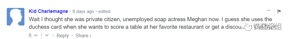 “等等,我以为她现在和我们一样都是小老百姓,是失业肥皂剧女演员梅根而已。大概当她想试图从最喜欢的餐厅订到位子,或想在沃尔玛获得折扣时,她就会亮出公爵夫人的身份。”
