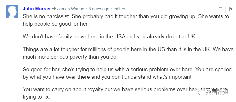 “她不是自恋狂,她可能比你(英国人)的成长经历更艰难。她想帮助别人,所以这没什么不好的。我们在美国没有家事假,而你们英国已经有了。对于美国的数百万人来说,我们的情况更艰难,贫困的人更多。