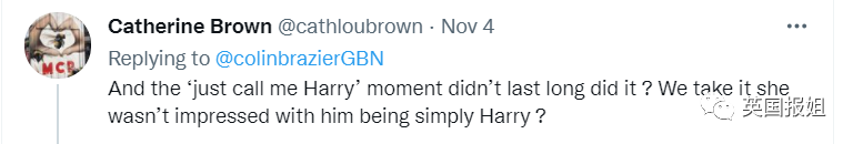 “哈里王子之前:‘就叫我哈里吧’的闪光时刻已经不复存在啦?她是不是不满意他只是个没有头衔的哈里了?”(其实哈里永远都有头衔,因为是世袭的)