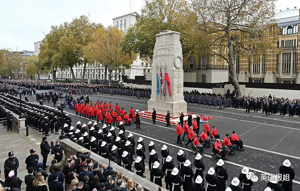 由于背伤造成第7次缺席,女王被安排在温莎城堡观看纪念日直播。为纪念碑送花圈的活动交给查尔斯王子执行,而女性出席者从往年的女王、卡米拉、凯特,临时改成了凯特,卡米拉和苏菲(爱德华王子的妻子)。