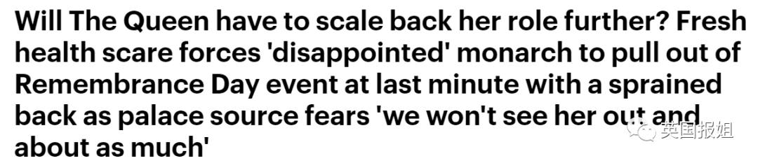 后来英媒证实,女王这次缺席重要活动是因为前一天突然背部扭伤,目前还不知道她是如何受伤的,可以确定的是她没有摔倒,鉴于女王以前就有背痛的毛病,也可能是旧伤复发。