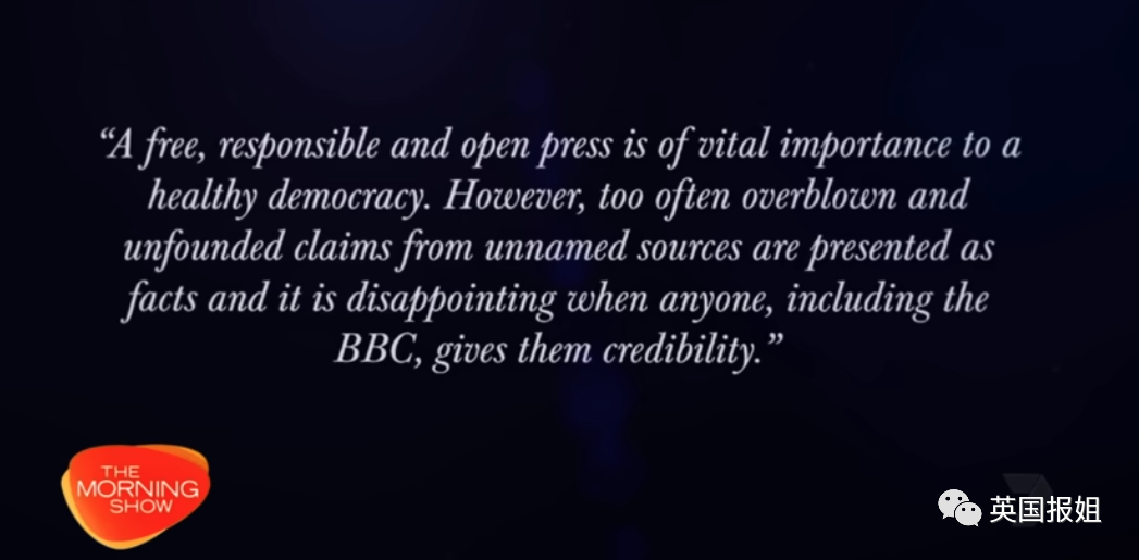 “一个自由、负责和开放的新闻界对健康的社会至关重要。然而,不可靠的消息来源,夸大和毫无根据的假新闻,常常被当作事实报道,任何媒体包括BBC,选择为这些内容推波助澜,实在令人失望。”