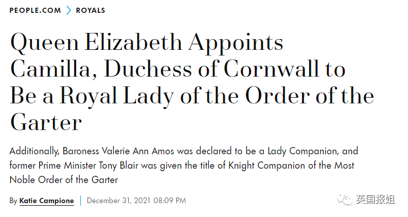2021年12月31日,白金汉宫公布了年度嘉德勋章获奖人。