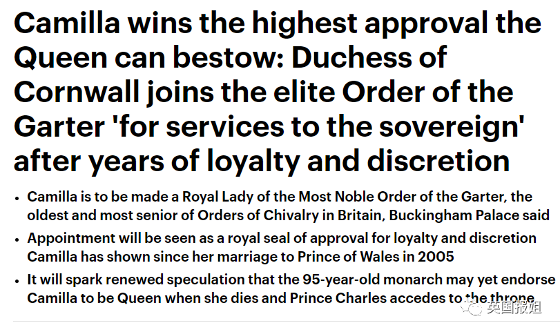 《女王颁发了嘉德勋章给卡米拉;让她成为‘皇家夫人Royal Lady’》