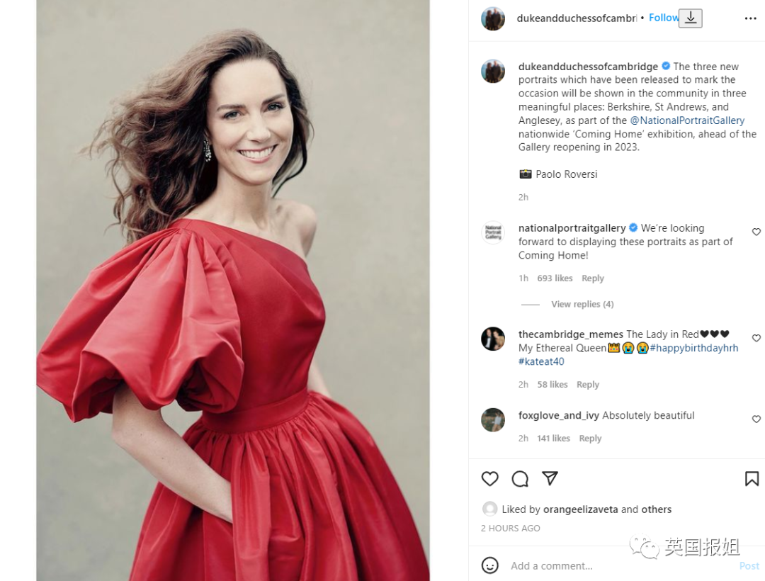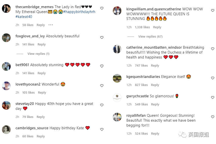 在下方评论中,几乎都是各种各样的彩虹屁,称赞凯特高贵典雅拥有王室气质十分惊艳,祝贺她四十岁生日,期待她成为未来的王后。