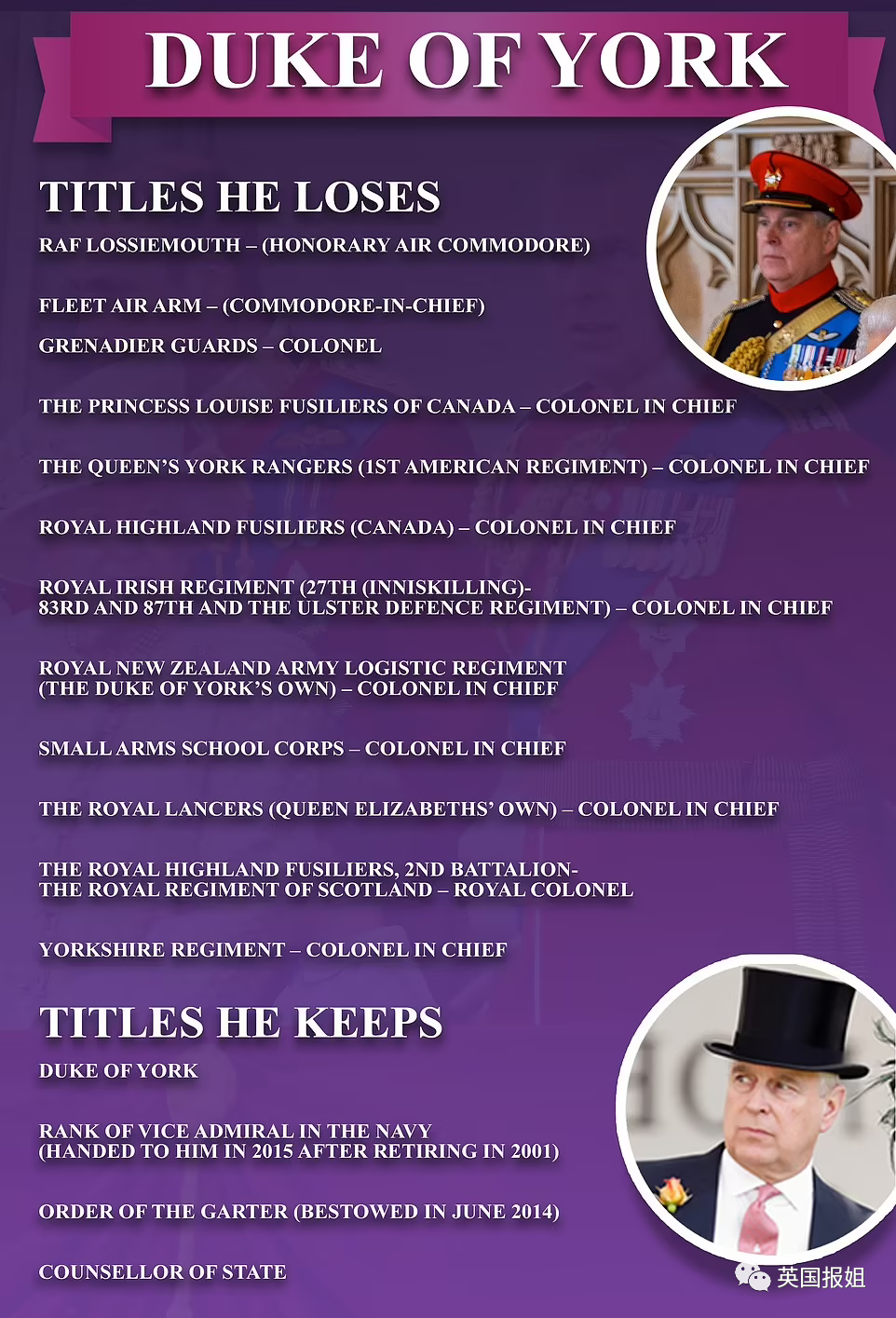 最重要的一条就是,安德鲁的“王室殿下”(HRH)称号被剥夺。这代表他在公众领域不能再以任何形式使用这个称号。对于安德鲁来说,这是天大的打击。