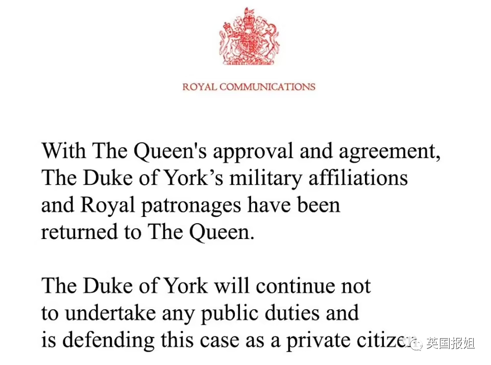 昨天下午,白金汉宫发出声明,宣布女王已经决定将安德鲁赶出王室。声明中提到,对安德鲁的惩治措施主要有三点:
