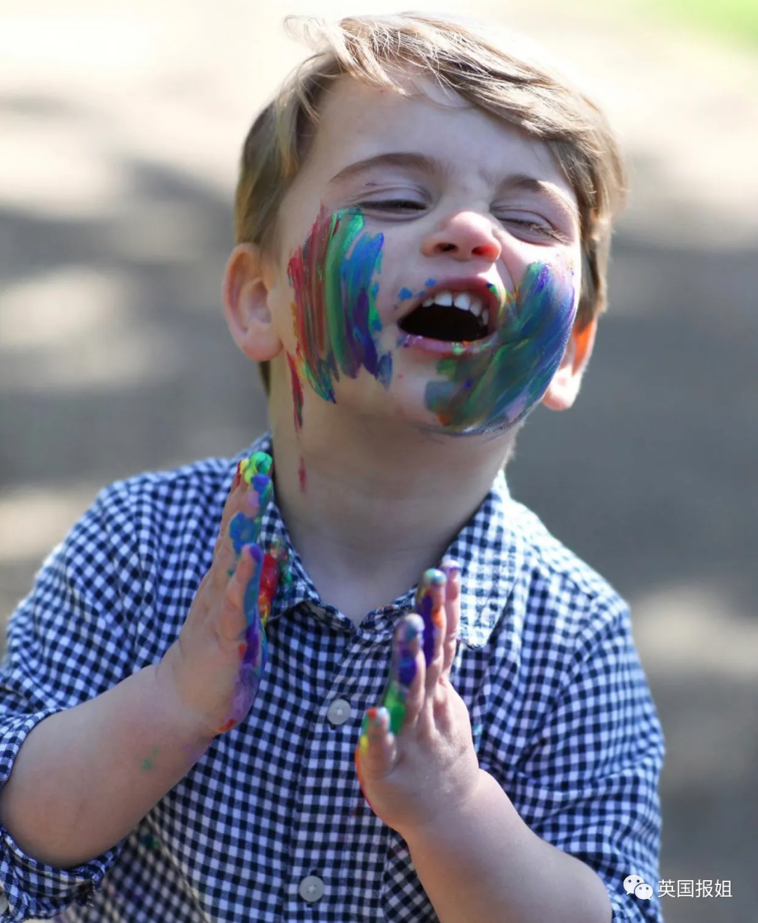 在公布的照片之中,甚至还会有这种把颜料涂得满脸都是的调皮捣蛋的时刻。