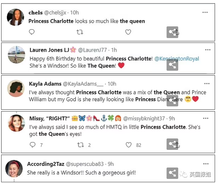 “我一直觉得小公主是女王和威廉的混合体,但妈呀她现在越来越像女王了!”