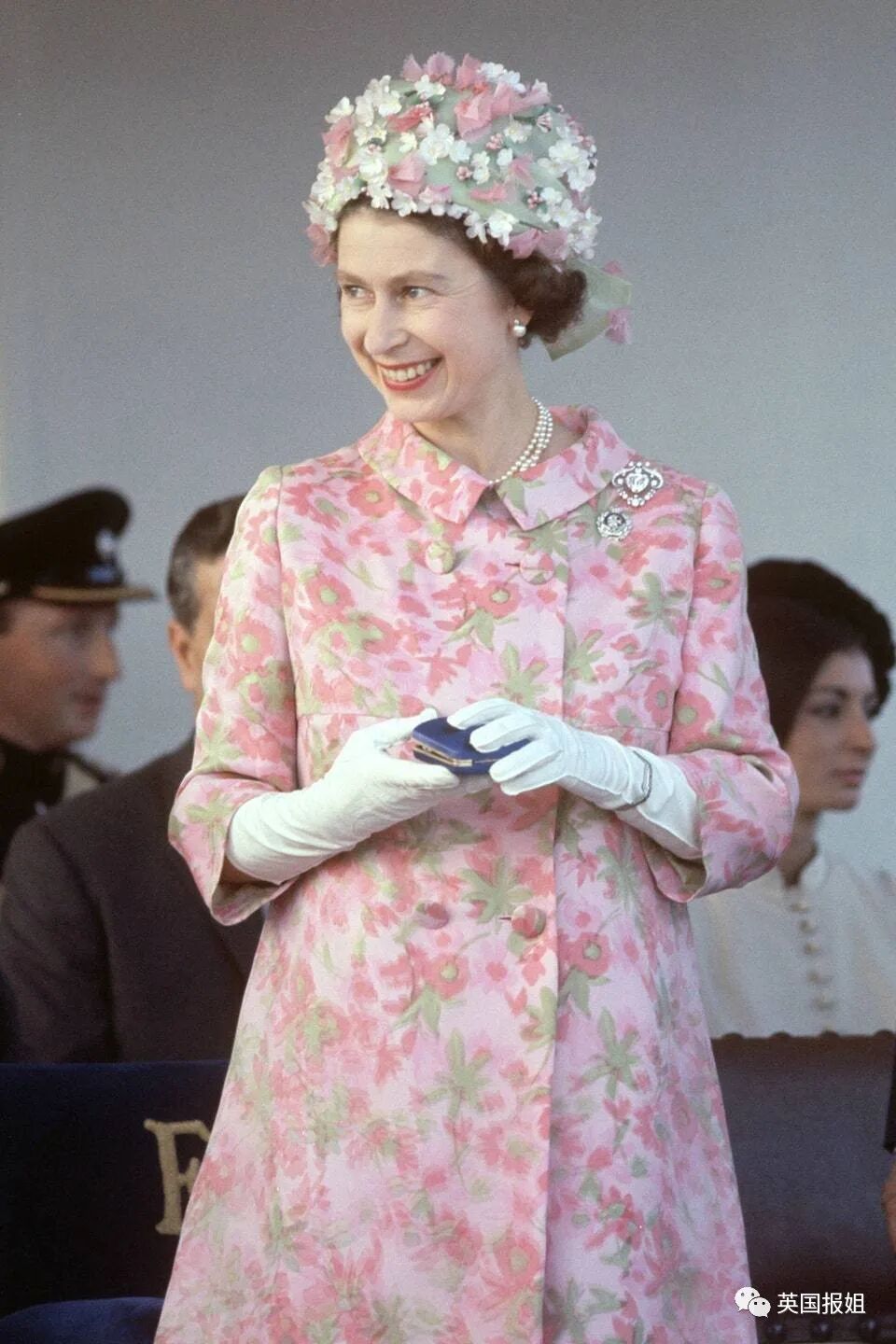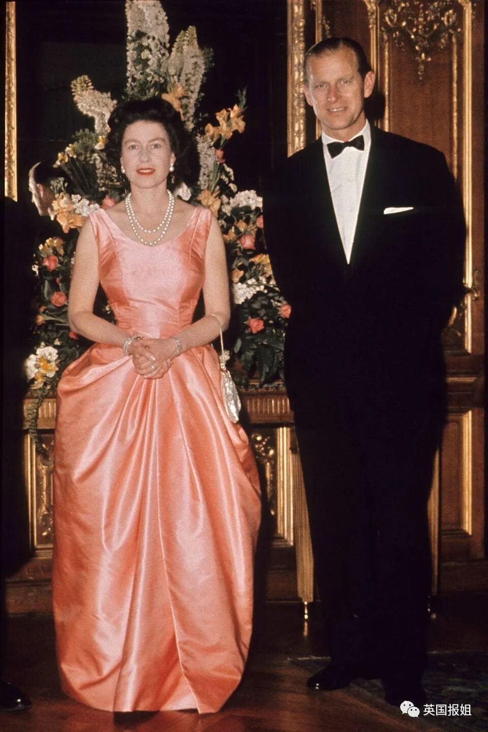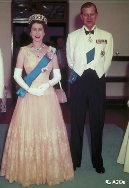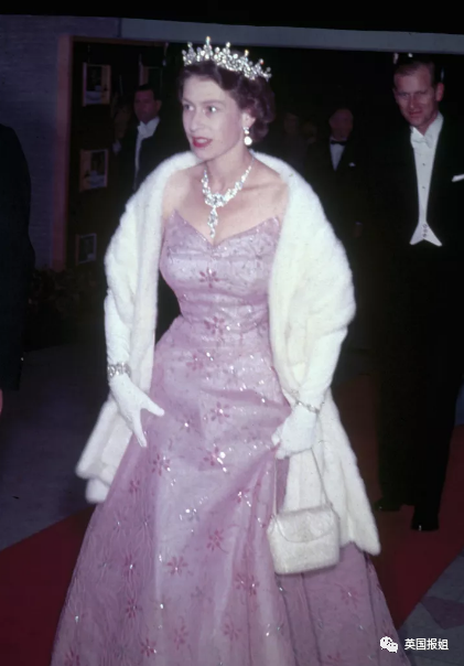 1963年,她和菲利普一起出席在伦敦举行的活动时,穿了一件设计很特别的珊瑚色晚礼服,配饰则是标志性的珍珠,温润又明艳。