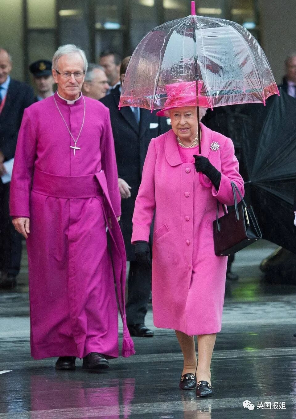 2015年访问伯明翰时的粉色套装,当天下雨,她还撑了一把有粉色装饰的小雨伞,整体粉得非常协调。