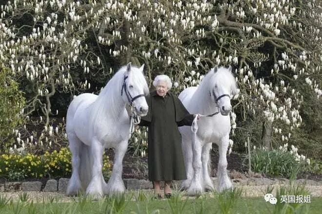照片里,女王站在她心爱的两匹小马中间,手上拉着小马们的缰绳,直视着镜头微笑的女王,还是一如既往的精神矍铄。