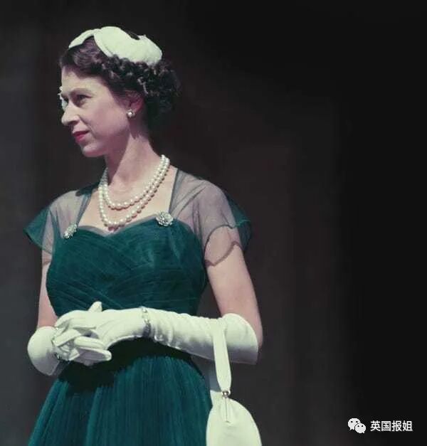 女王永远都是这种会让人眼前一亮的穿着,1957年拜访当时的法国第一夫人时,这条绿色礼服就很抢眼。