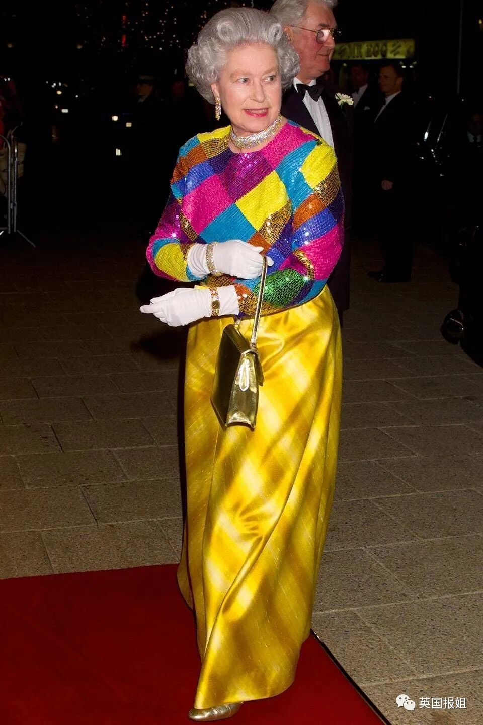 不过芭比粉再亮可能还是亮不过1999年这套彩色亮片上衣和金色条纹半身裙,也许是为了配合观看皇家文艺汇演的热烈氛围,女王直接变迪斯科风。